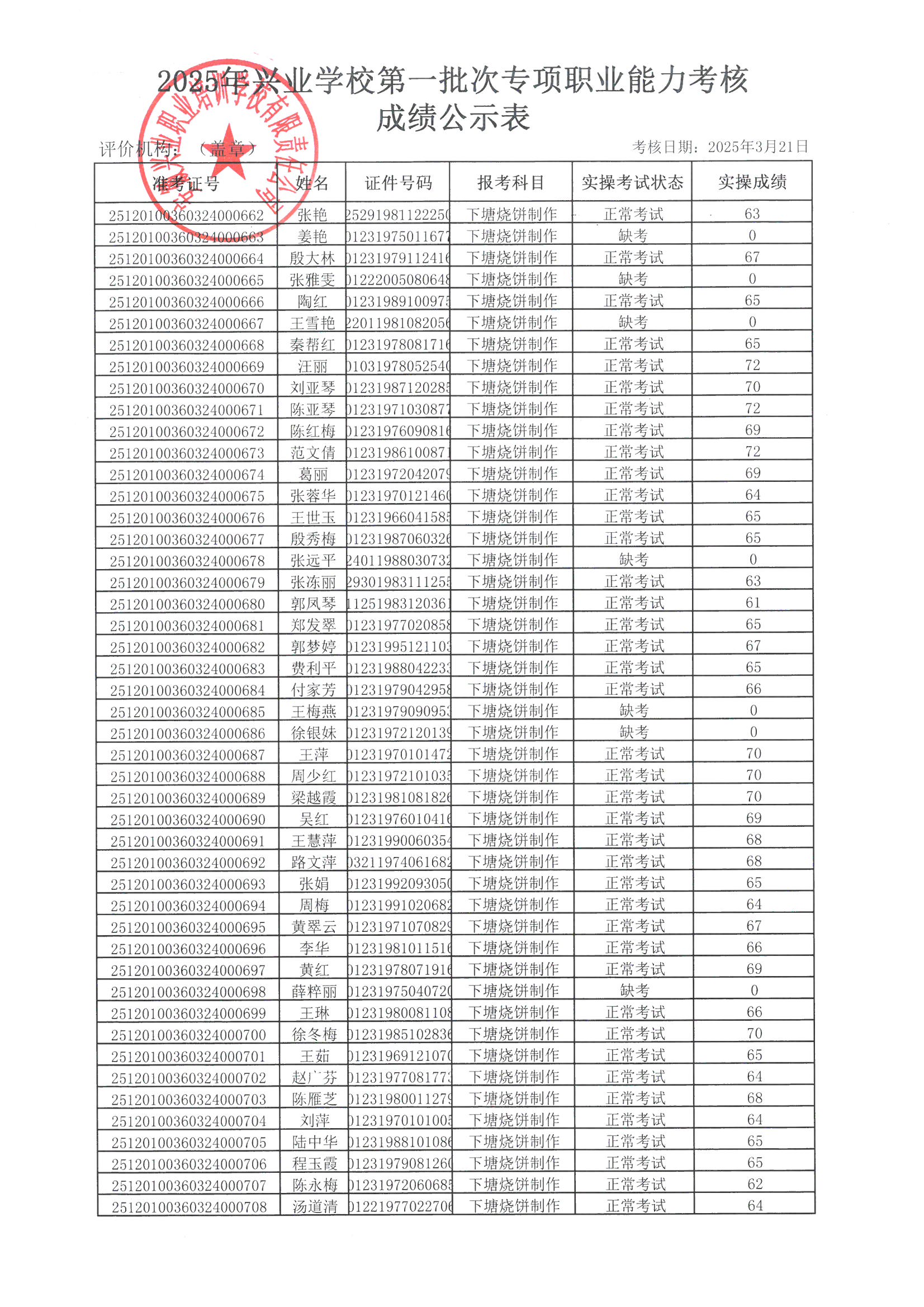 2025年兴业学校第一批次专项职业能力考核成绩现已公示,公示期7天,
